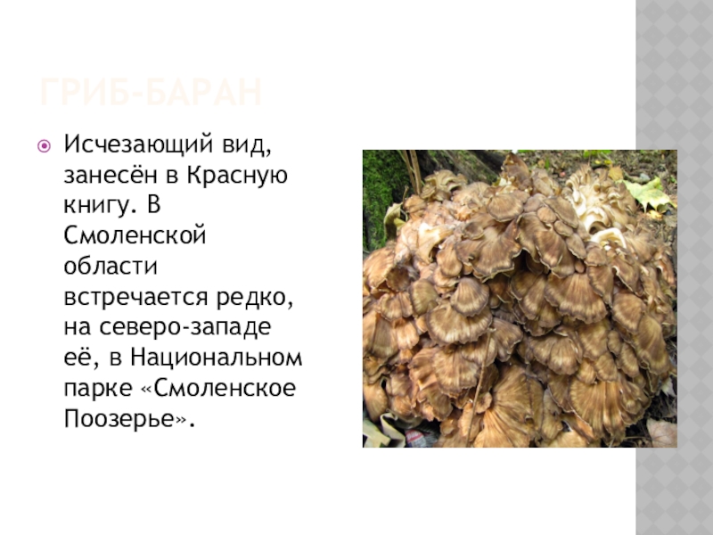 Гриб-баранИсчезающий вид, занесён в Красную книгу. В Смоленской области встречается редко, на северо-западе её, в Национальном парке
