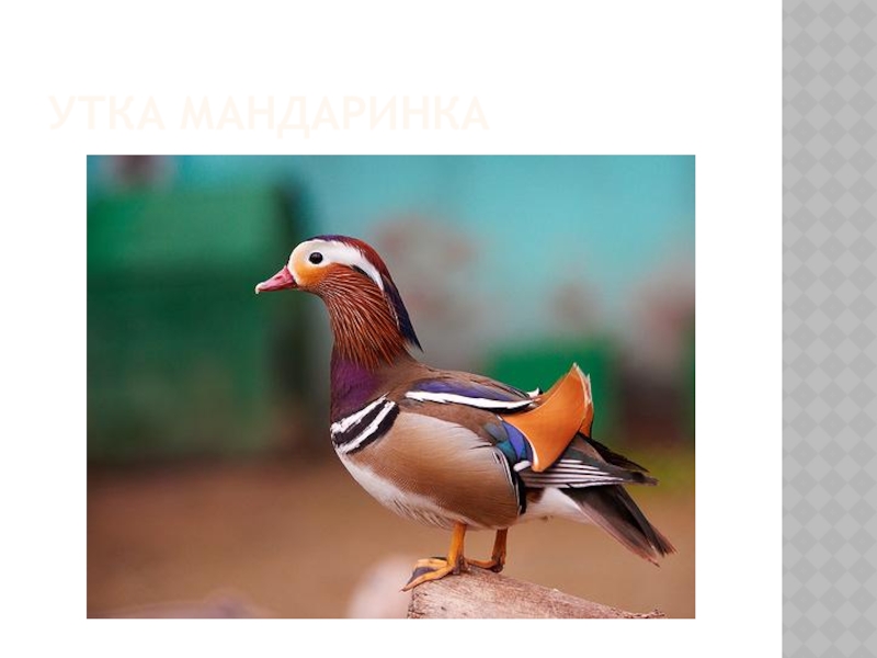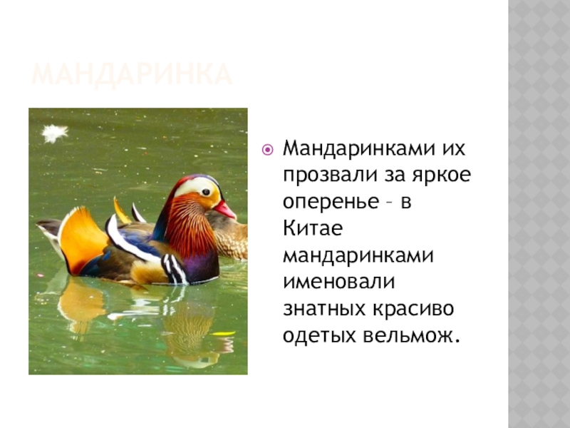МандаринкаМандаринками их прозвали за яркое оперенье – в Китае мандаринками именовали знатных красиво одетых вельмож.