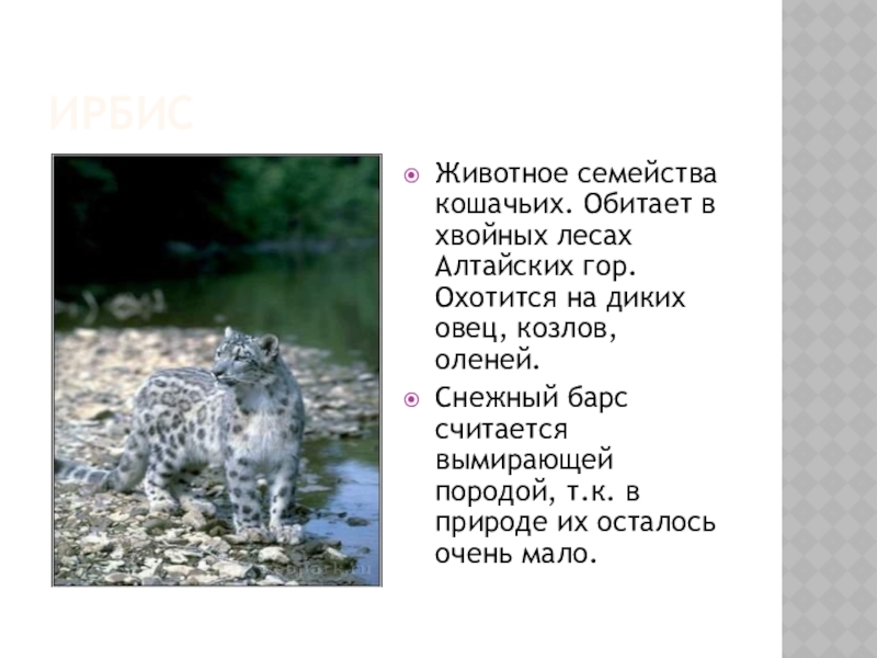 ИрбисЖивотное семейства кошачьих. Обитает в хвойных лесах Алтайских гор. Охотится на диких овец, козлов, оленей.Снежный барс считается