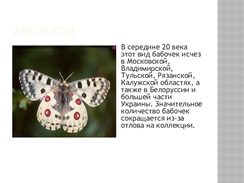 АполлонВ середине 20 века этот вид бабочек исчез в Московской, Владимирской, Тульской, Рязанской, Калужской областях, а также