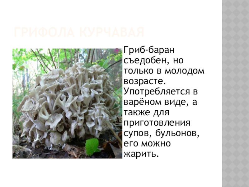 Грифола курчаваяГриб-баран съедобен, но только в молодом возрасте. Употребляется в варёном виде, а также для приготовления супов,