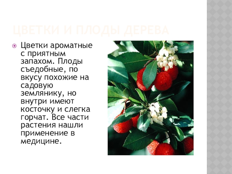 Цветки и плоды дереваЦветки ароматные с приятным запахом. Плоды съедобные, по вкусу похожие на садовую землянику, но