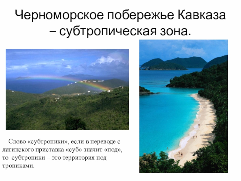 Черноморское побережье Кавказа – субтропическая зона.Слово «субтропики», если в переводе с латинского приставка «суб» значит «под», то