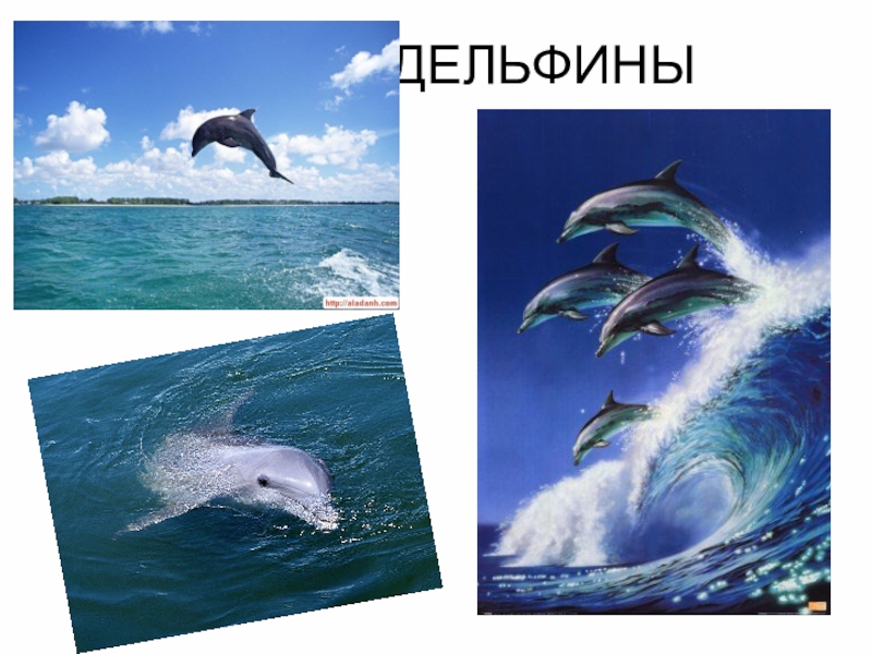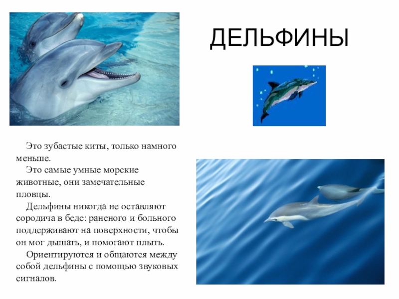 ДЕЛЬФИНЫЭто зубастые киты, только намного меньше.Это самые умные морские животные, они замечательные пловцы.Дельфины никогда не оставляют сородича