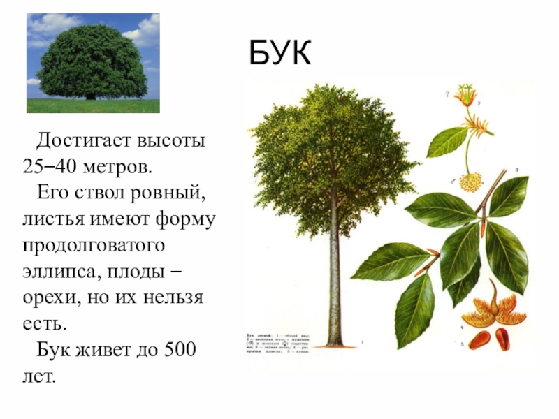 БУКДостигает высоты 25–40 метров.Его ствол ровный, листья имеют форму продолговатого эллипса, плоды – орехи, но их нельзя