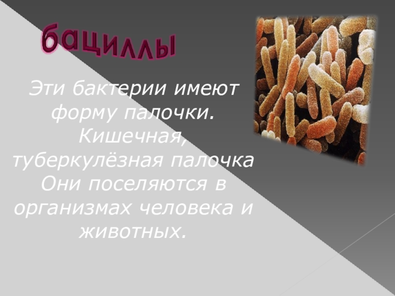 Эти бактерии имеют форму палочки.Кишечная, туберкулёзная палочкаОни поселяются в организмах человека и животных.