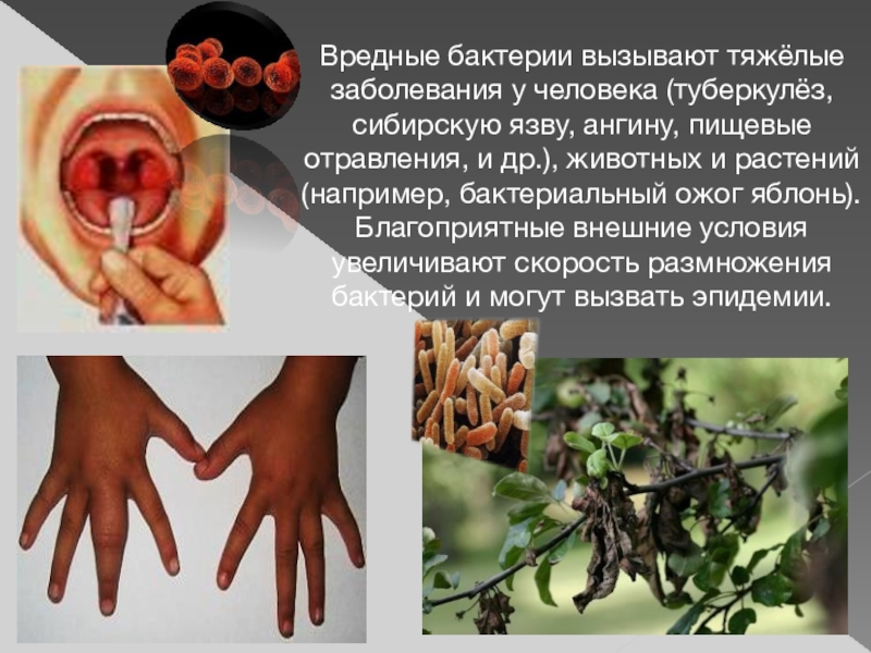 Вредные бактерии вызывают тяжёлые заболевания у человека (туберкулёз, сибирскую язву, ангину,