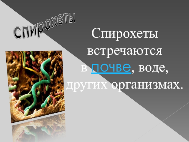 Слайд 9Спирохеты встречаются в почве, воде, других организмах.