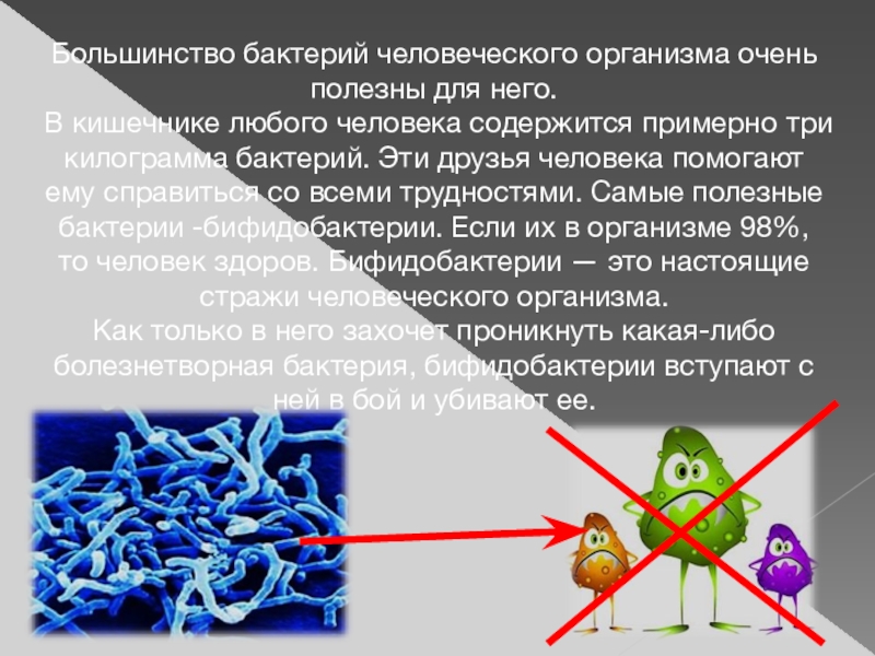 содержится примерно три килограмма бактерий. Эти друзья человека помогают ему справиться со всеми трудностями. Самые полезные бактерии -бифидобактерии. Если их в организме 98%, то человек здоров. Бифидобактерии — это настоящие стражи человеческого организма.