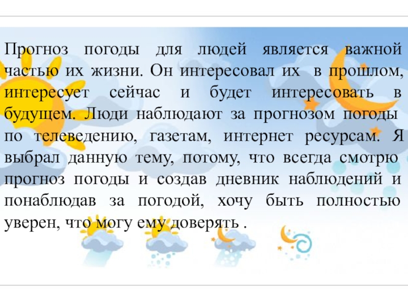 Провести исследование по прогнозу погоды и составить журнал наблюдений погоды.