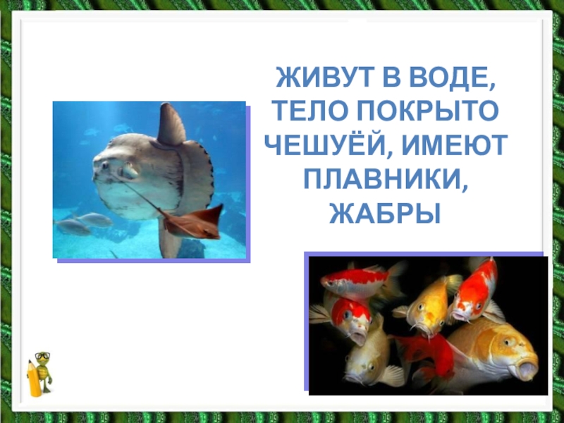 Рыбы Живут в воде, Тело покрыто чешуёй, имеют плавники, жабры