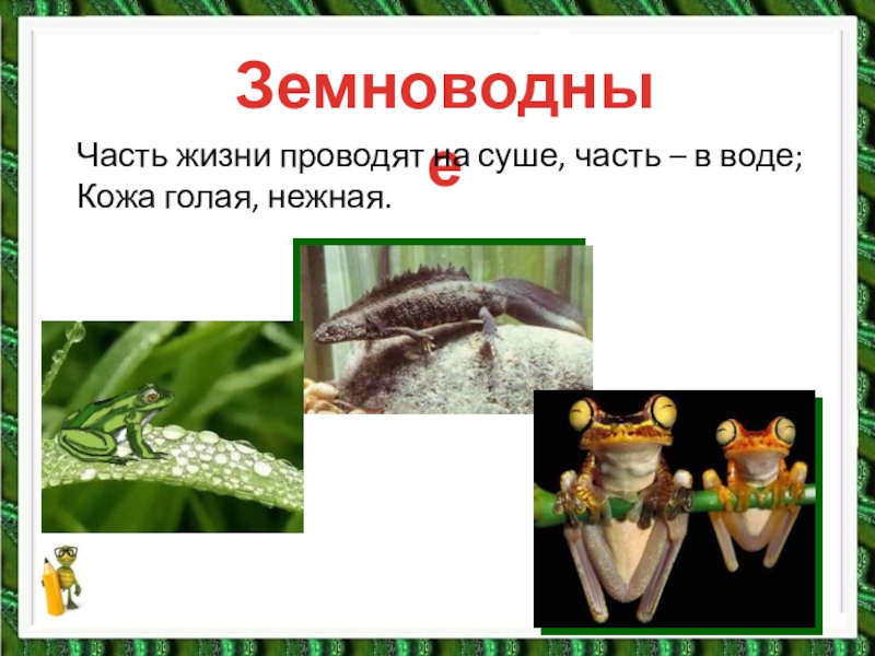 Земноводные Часть жизни проводят на суше, часть – в воде;Кожа голая, нежная.
