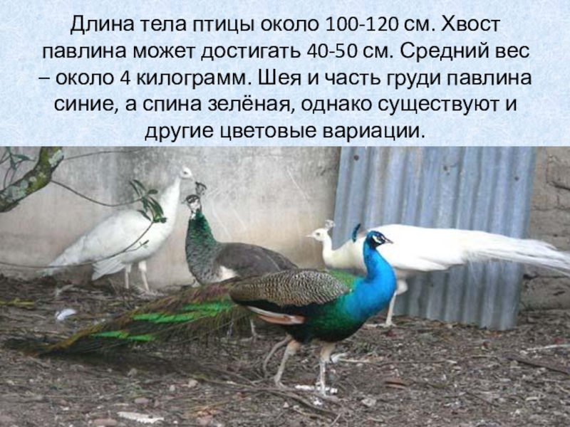 Слайд 4 Длина тела птицы около 100-120 см. Хвост павлина может достигать 40-50