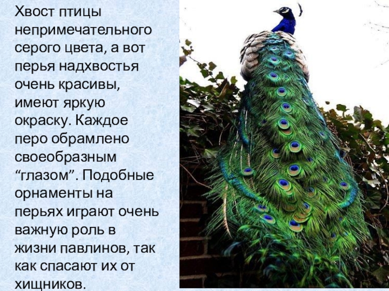 имеют яркую окраску. Каждое перо обрамлено своеобразным “глазом”. Подобные орнаменты на перьях играют очень важную роль в жизни павлинов, так как спасают их от хищников.