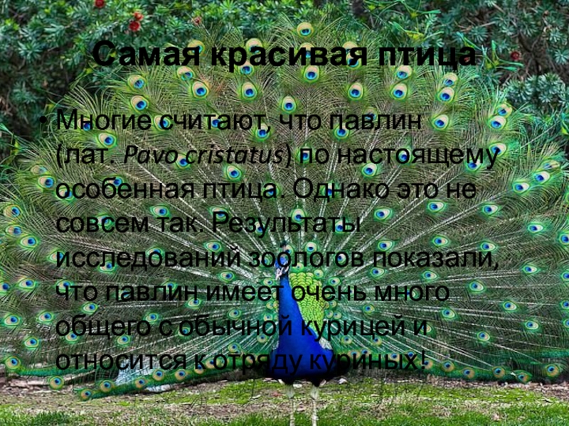 Самая красивая птицаМногие считают, что павлин (лат. Pavo cristatus) по настоящему особенная птица. Однако это не совсем так. Результаты исследований зоологов показали, что павлин имеет очень много общего с обычной курицей и относится к отряду куриных!