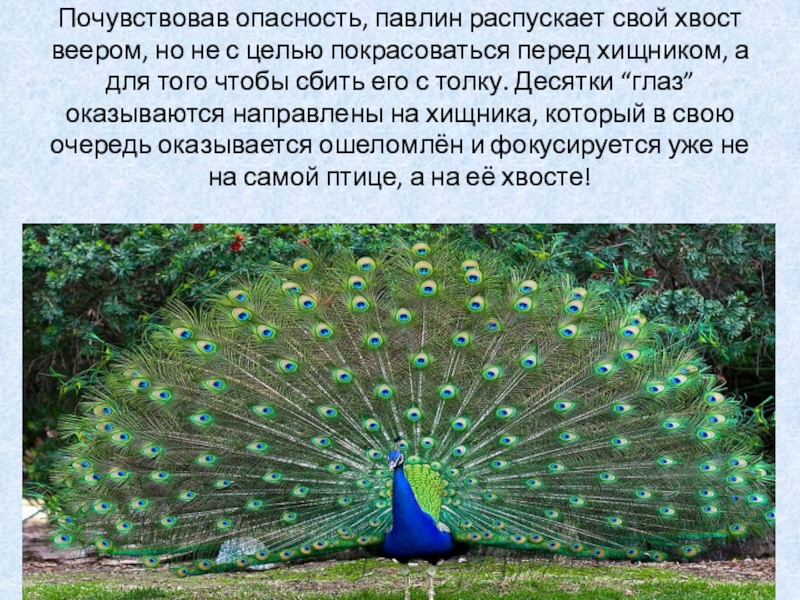Слайд 6Почувствовав опасность, павлин распускает свой хвост веером, но не с целью