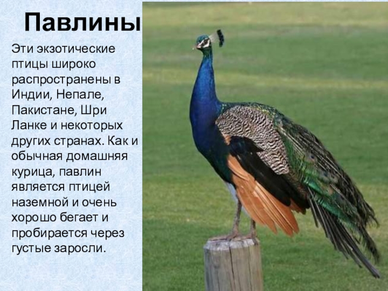 ПавлиныЭти экзотические птицы широко распространены в Индии, Непале, Пакистане, Шри Ланке и некоторых других странах. Как и