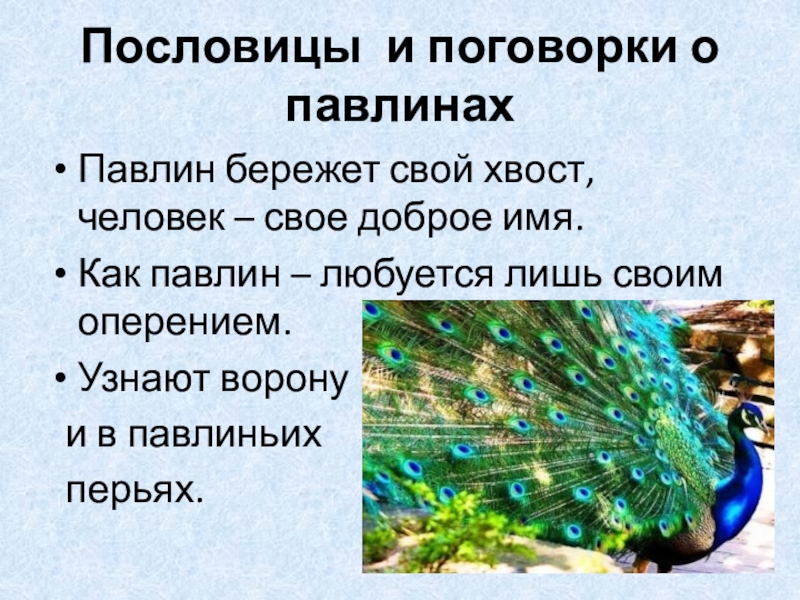Пословицы и поговорки о павлинахПавлин бережет свой хвост, человек – свое доброе имя.Как павлин – любуется лишь
