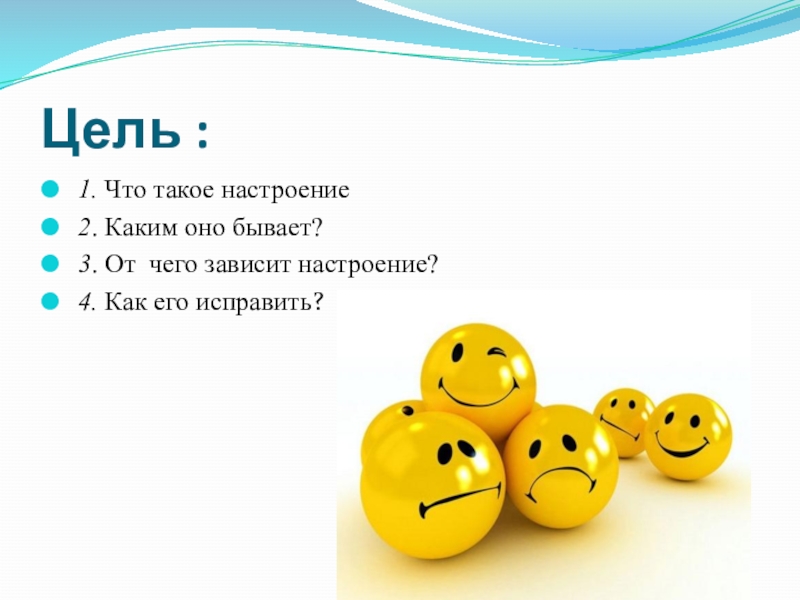 Цель :  1. Что такое настроение 2. Каким оно бывает? 3. От чего зависит настроение? 4. Как