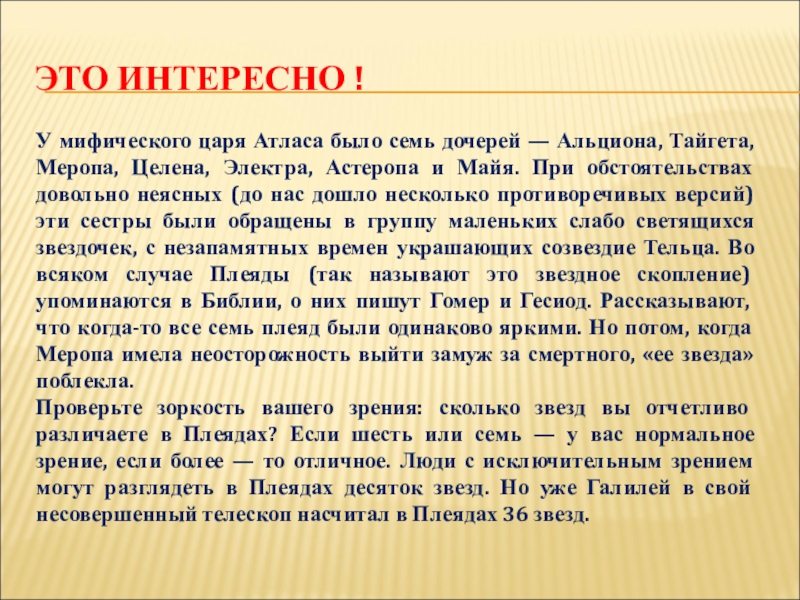 Проверьте зоркость вашего зрения: сколько звезд вы отчетливо различаете в Плеядах? Если шесть или семь — у вас нормальное зрение, если более — то отличное. Люди с исключительным зрением могут разглядеть в Плеядах десяток звезд. Но уже Галилей в свой несовершенный телескоп насчитал в Плеядах 36 звезд.