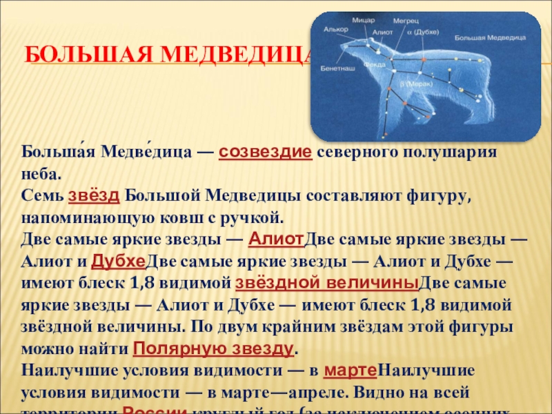Две самые яркие звезды — АлиотДве самые яркие звезды — Алиот и ДубхеДве самые яркие звезды — Алиот и Дубхе — имеют блеск 1,8 видимой звёздной величиныДве самые яркие звезды — Алиот и Дубхе — имеют блеск 1,8 видимой звёздной величины. По двум крайним звёздам этой фигуры можно найти Полярную звезду.