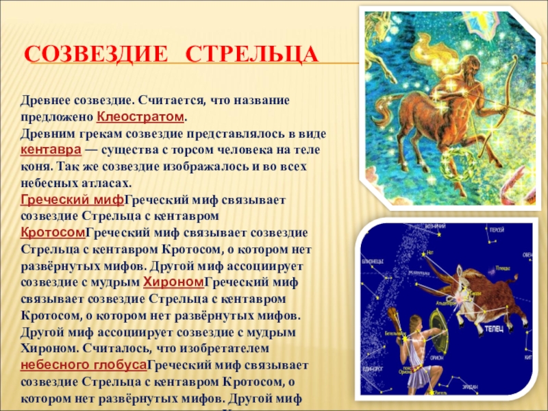 Греческий мифГреческий миф связывает созвездие Стрельца с кентавром КротосомГреческий миф связывает созвездие Стрельца с кентавром Кротосом, о котором нет развёрнутых мифов. Другой миф ассоциирует созвездие с мудрым ХирономГреческий миф связывает созвездие Стрельца с кентавром Кротосом, о котором нет развёрнутых мифов. Другой миф ассоциирует созвездие с мудрым Хироном. Считалось, что изобретателем небесного глобусаГреческий миф связывает созвездие Стрельца с кентавром Кротосом, о котором нет развёрнутых мифов. Другой миф ассоциирует созвездие с мудрым Хироном. Считалось, что изобретателем небесного глобуса был кентавр Хирон, создавший его специально для похода аргонавтовГреческий миф связывает созвездие Стрельца с кентавром Кротосом, о котором нет развёрнутых мифов. Другой миф ассоциирует созвездие с мудрым Хироном. Считалось, что изобретателем небесного глобуса был кентавр Хирон, создавший его специально для похода аргонавтов. На глобусе Хирон оставил место для себя в виде зодиакального созвездия Стрелец. Но кентавр Кротос опередил Хирона, заняв его небесное место, и тому пришлось довольствоваться менее почётным по положению созвездием Центавр.