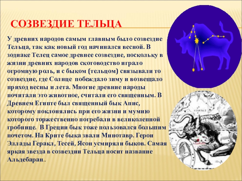 новый год начинался весной. В зодиаке Телец самое древнее созвездие, поскольку в жизни древних народов скотоводство играло огромную роль, и с быком (тельцом) связывали то созвездие, где Солнце побеждало зиму и возвещало приход весны и лета. Многие древние народы почитали это животное, считали его священным. В Древнем Египте был священный бык Апис, которому поклонялись при его жизни и мумию которого торжественно погребали в великолепной гробнице. В Греции бык тоже пользовался большим почетом. На Крите быка звали Минотавр. Герои Эллады Геракл, Тесей, Ясон усмиряли быков. Самая яркая звезда в созвездии Тельца носит название Альдебаран..