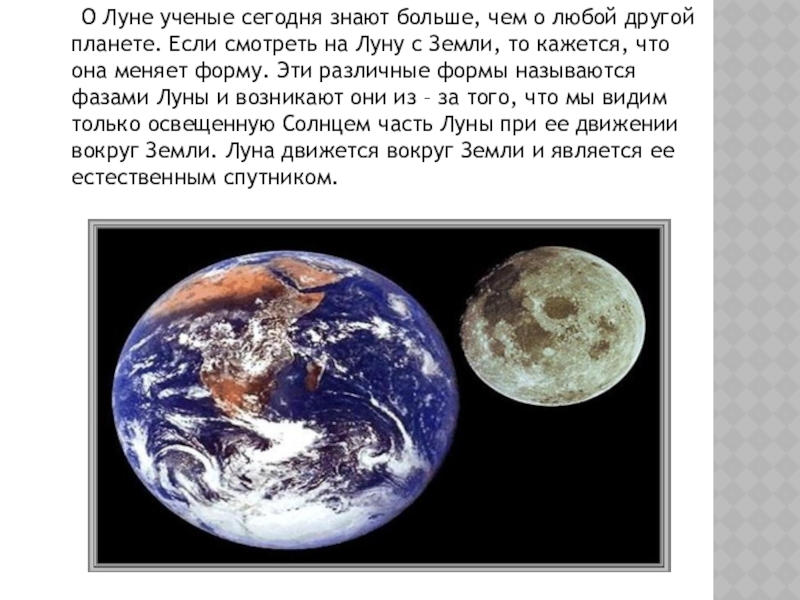 любой другой планете. Если смотреть на Луну с Земли, то кажется, что она меняет форму. Эти различные формы называются фазами Луны и возникают они из – за того, что мы видим только освещенную Солнцем часть Луны при ее движении вокруг Земли. Луна движется вокруг Земли и является ее естественным спутником.