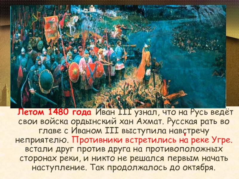 войска ордынский хан Ахмат. Русская рать во главе с Иваном III выступила навстречу неприятелю. Противники встретились на реке Угре. встали друг против друга на противоположных сторонах реки, и никто не решался первым начать наступление. Так продолжалось до октября.