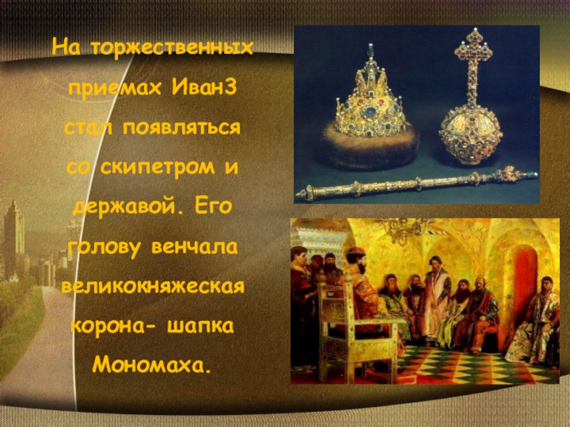 Слайд 38На торжественных приемах Иван3 стал появляться со скипетром и державой. Его