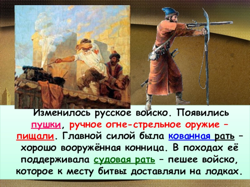 Слайд 9 Изменилось русское войско. Появились пушки, ручное огне-стрельное оружие – пищали. Главной