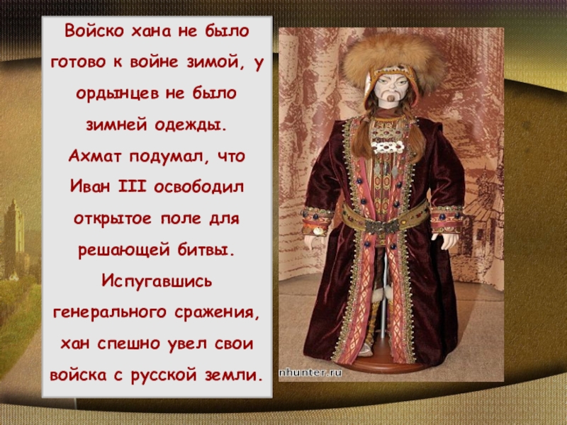 Слайд 22Войско хана не было готово к войне зимой, у ордынцев не