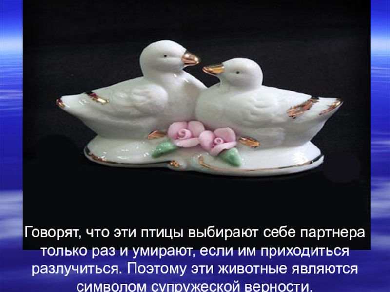 Слайд 15 Говорят, что эти птицы выбирают себе партнера только раз и умирают,