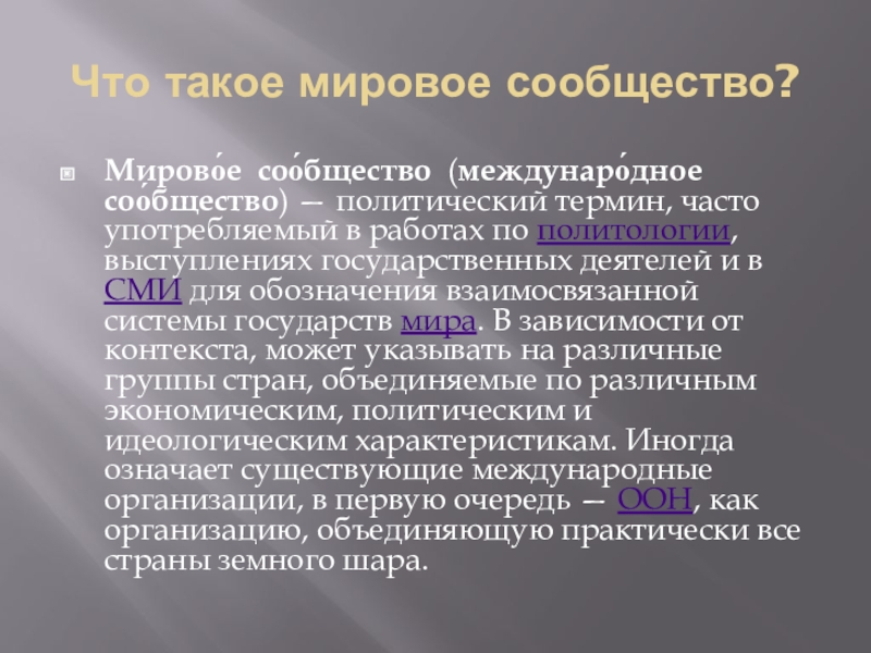 Что такое мировое сообщество?Мирово́е соо́бщество (междунаро́дное соо́бщество) — политический термин, часто употребляемый в работах по политологии, выступлениях государственных