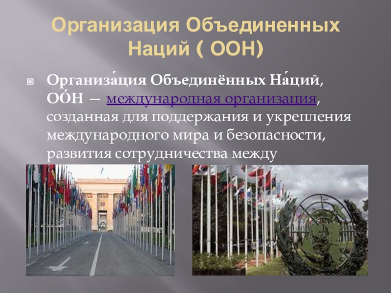 Организация Объединенных Наций ( ООН)Организа́ция Объединённых На́ций, ОО́Н — международная организация, созданная для поддержания и укрепления международного мира