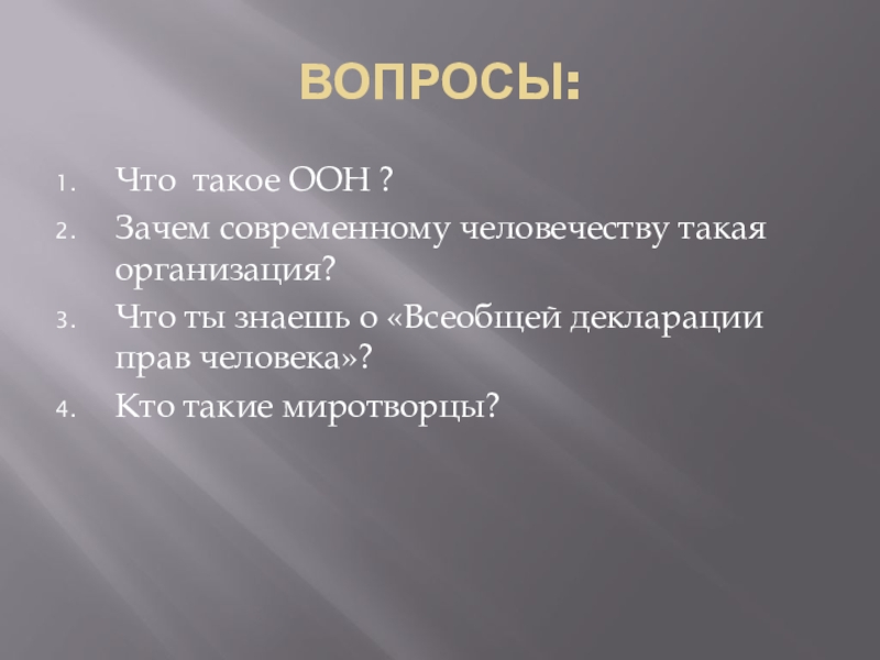 ВОПРОСЫ:Что такое ООН ?Зачем современному человечеству такая организация?Что ты знаешь о «Всеобщей декларации прав человека»?Кто такие миротворцы?