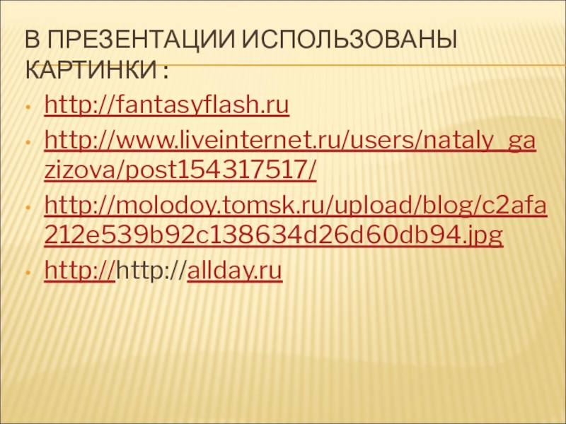 В ПРЕЗЕНТАЦИИ ИСПОЛЬЗОВАНЫ КАРТИНКИ :http://fantasyflash.ruhttp://www.liveinternet.ru/users/nataly_gazizova/post154317517/http://molodoy.tomsk.ru/upload/blog/c2afa212e539b92c138634d26d60db94.jpghttp://http://allday.ru