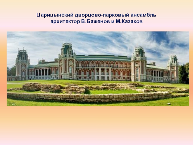 Слайд 15Царицынский дворцово-парковый ансамбль архитектор В.Баженов и М.Казаков