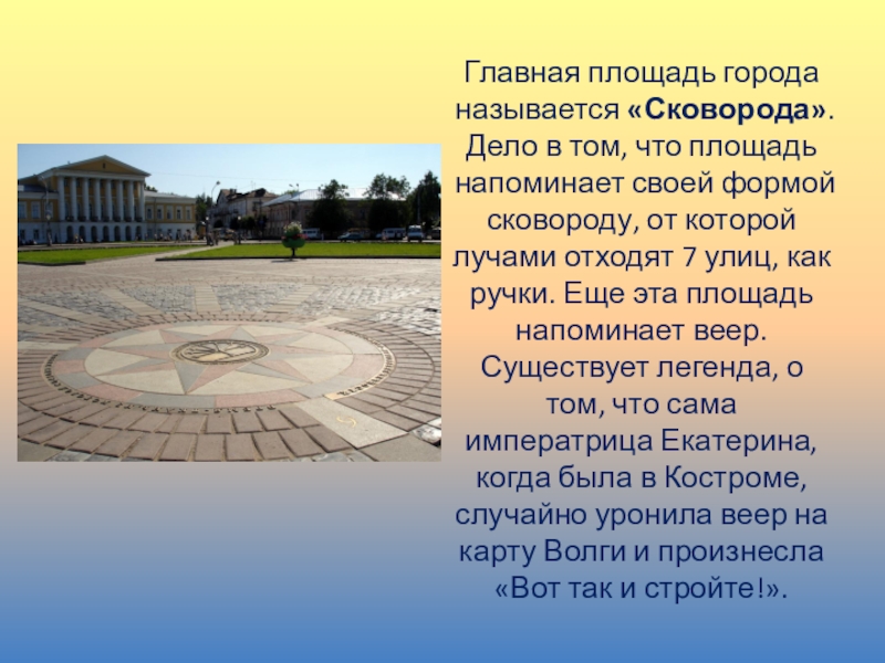 своей формой сковороду, от которой лучами отходят 7 улиц, как ручки. Еще эта площадь напоминает веер. Существует легенда, о том, что сама императрица Екатерина, когда была в Костроме, случайно уронила веер на карту Волги и произнесла «Вот так и стройте!».