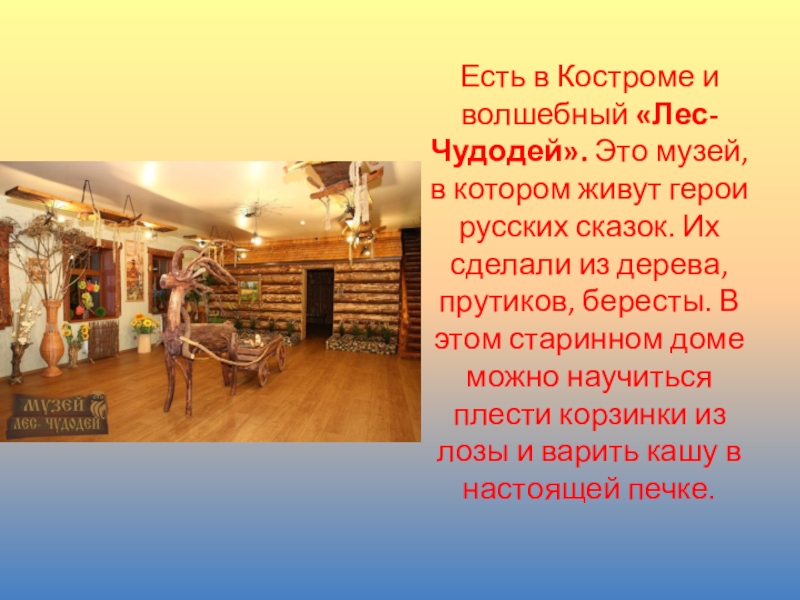 Слайд 5Есть в Костроме и волшебный «Лес-Чудодей». Это музей, в котором живут