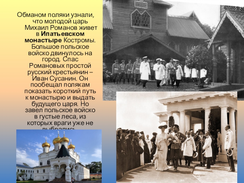 монастыре Костромы. Большое польское войско двинулось на город. Спас Романовых простой русский крестьянин – Иван Сусанин. Он пообещал полякам показать короткий путь к монастырю и выдать будущего царя. Но завел польское войско в густые леса, из которых враги уже не выбрались.