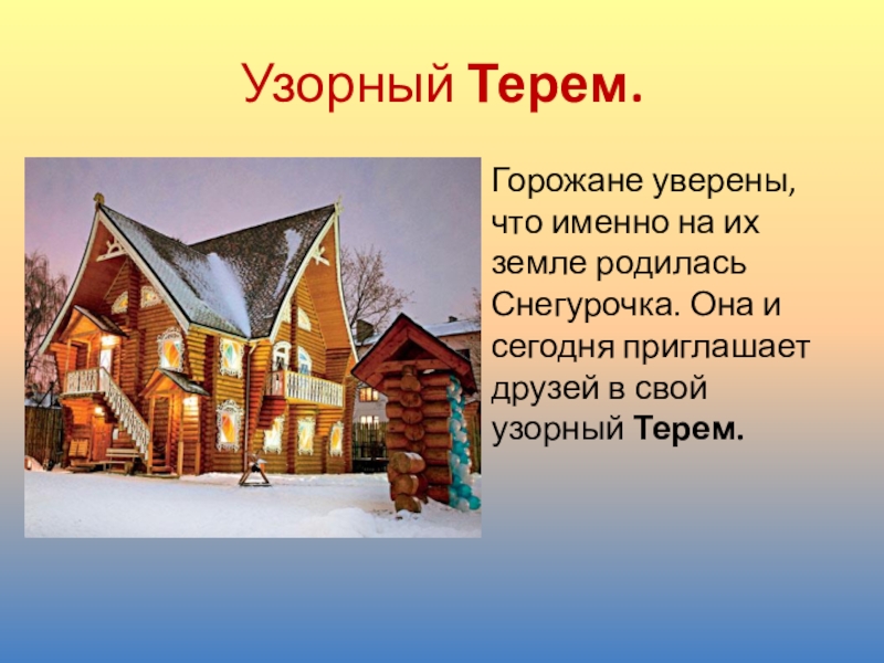 Узорный Терем.Горожане уверены, что именно на их земле родилась Снегурочка. Она и сегодня приглашает друзей в свой