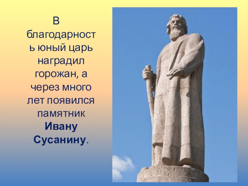 В благодарность юный царь наградил горожан, а через много лет появился памятник Ивану Сусанину.