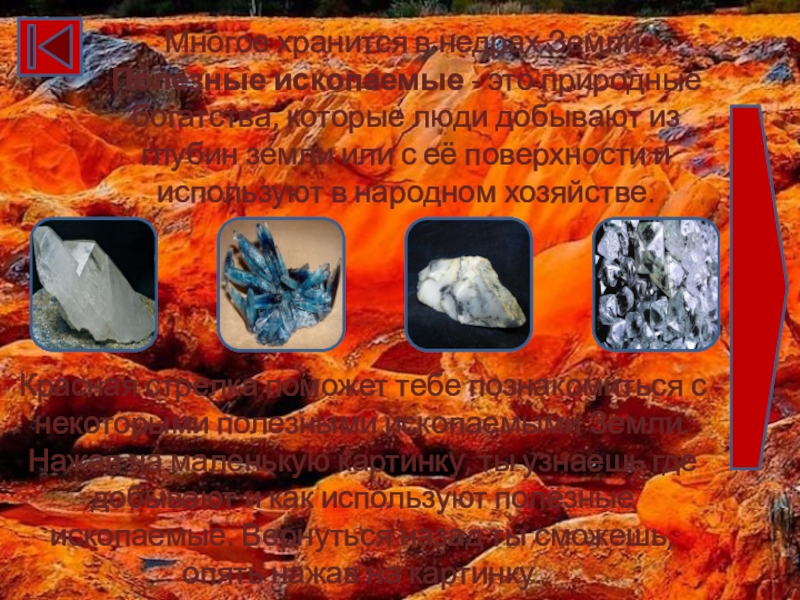Нажав на маленькую картинку, ты узнаешь где добывают и как используют полезные ископаемые. Вернуться назад ты сможешь, опять нажав на картинку.