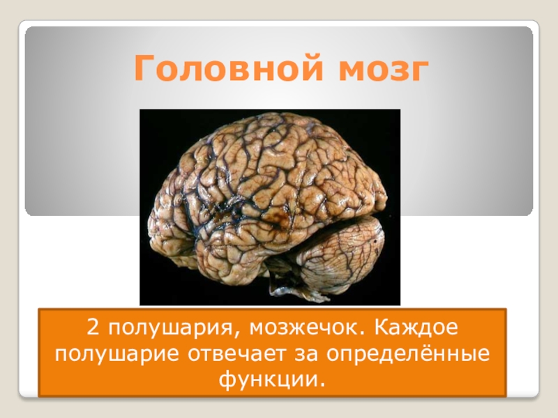 Головной мозг2 полушария, мозжечок. Каждое полушарие отвечает за определённые функции.
