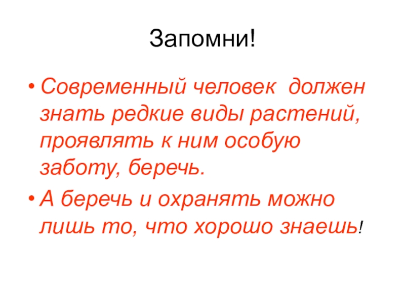 Запомни!Современный человек  должен знать редкие виды растений, проявлять к ним особую заботу, беречь. А беречь и охранять