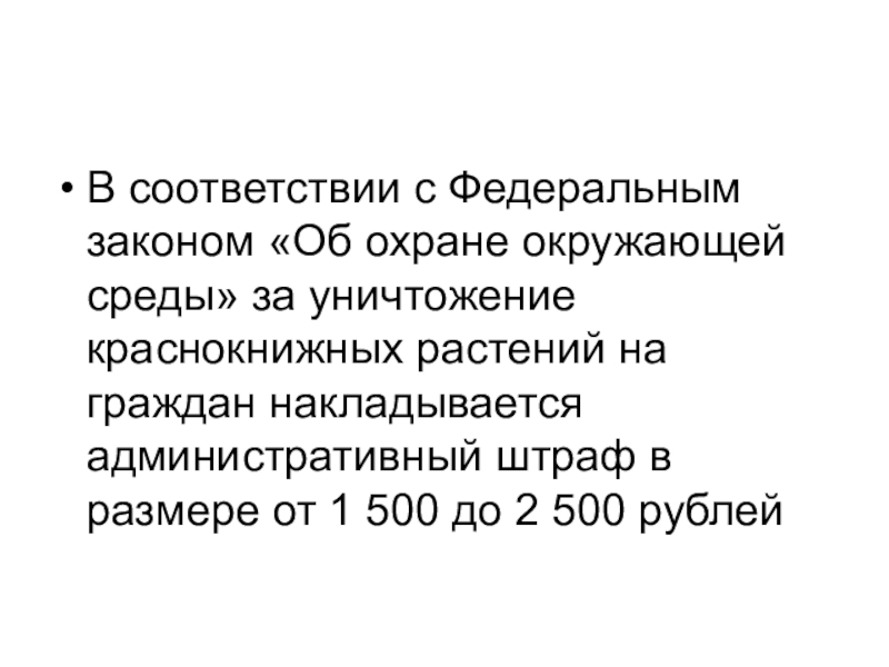 В соответствии с Федеральным законом «Об охране окружающей среды» за уничтожение краснокнижных растений на граждан накладывается административный
