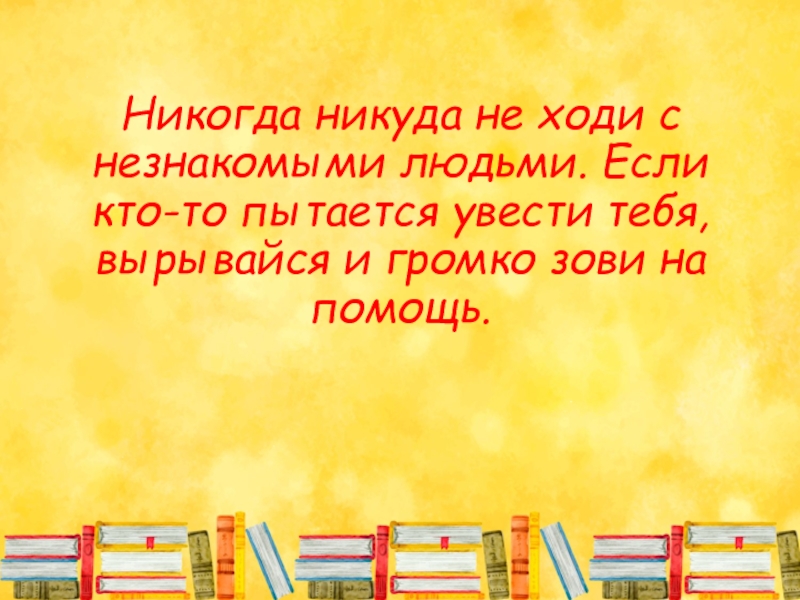 Слайд 7Никогда никуда не ходи с незнакомыми людьми. Если кто-то пытается увести