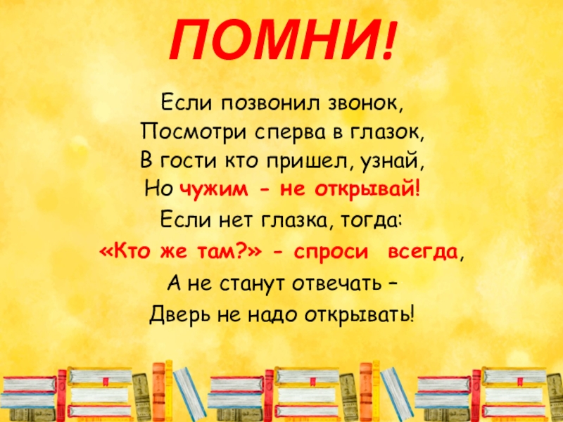 ПОМНИ!Если позвонил звонок,Посмотри сперва в глазок,В гости кто пришел, узнай,Но чужим - не открывай!Если нет глазка, тогда: