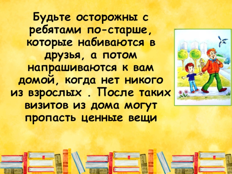 Слайд 14Будьте осторожны с ребятами по-старше, которые набиваются в друзья, а потом